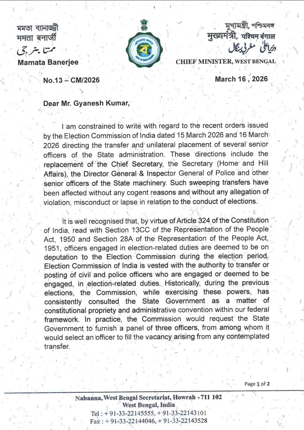 मुख्यमंत्री ने यह पत्र मुख्य चुनाव आयुक्त ज्ञानेश कुमार को भेजा है। इसमें उन्होंने राज्य प्रशासन के कई वरिष्ठ अधिकारियों को अचानक हटाने के फैसले पर चिंता और आश्चर्य व्यक्त किया है।