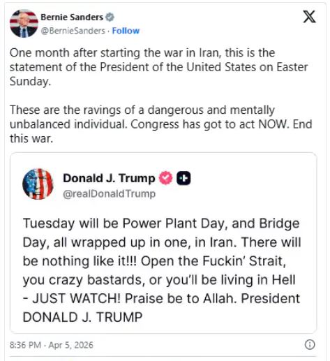 06 अप्रैल 2026, वॉशिंगटनअमेरिका में ईरान को लेकर बढ़ते तनाव के बीच राजनीतिक बयानबाजी तेज हो गई है। डेमोक्रेटिक सीनेटर बर्नी सैंडर्स ने राष्ट्रपति डोनाल्ड ट्रंप के हालिया बयान की कड़ी आलोचना करते हुए उसे “खतरनाक और असंतुलित” बताया है।